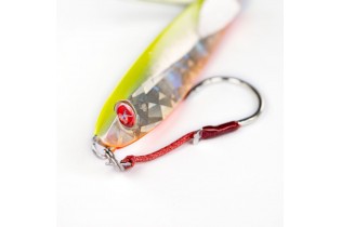 La Leppa 77 Slim incluye un anzuelo assist y un anzuelo BKK para slow jigging, número 3/0, especialmente indicado para la pesca desde la orilla con depredadores costeros como medregales, meros, dorados y pargos.